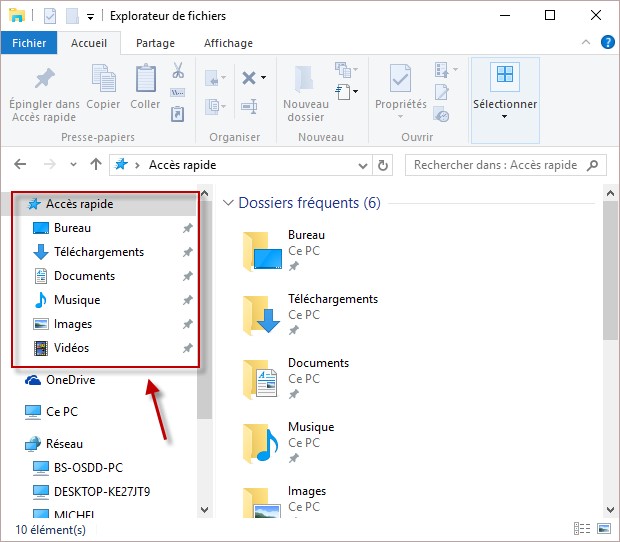 Les bibliothèques sont accessibles sous le libellé Accès rapide de l’Explorateur de fichiers. Les bibliothèques par défaut sont les suivantes : Bureau, Téléchargements, Documents, Musique, Images et Vidéos :