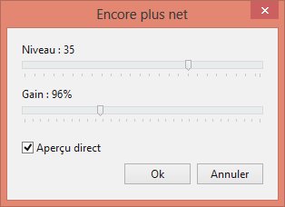 A titre d’exemple, nous allons utiliser la commande Netteté / Encore plus net. La boîte de dialogue Encore plus net s’affiche. Cochez la case Aperçu direct et modifiez les deux curseurs pour obtenir l’effet souhaité. Ici par exemple, nous choisissons un niveau égal à 35 et un gain égal à 96%.