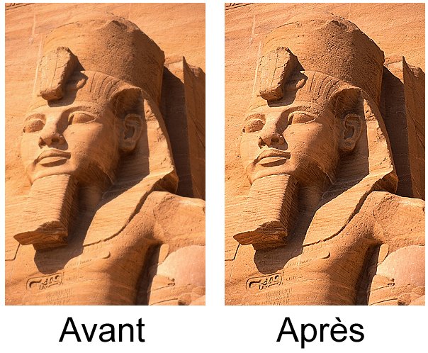 Nous allons commencer par améliorer la netteté d’une photo légèrement floue, issue du temple égyptien d’Abou Simbel. Déroulez le menu Filtre et pointez Netteté. De la plus légère à la plus marquée, quatre commandes sont disponibles.