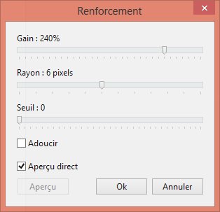 Déroulez le menu Filtre, pointez Netteté et cliquez sur Renforcement. La boîte de dialogue Renforcement s’affiche. Cochez la case Aperçu direct et agissez sur les curseurs pour obtenir le meilleur résultat possible. Comme vous pouvez le voir, l’augmentation du contraste introduit l’apparition de grain. Pour cette photo, de mon point de vue, le meilleur compromis correspond à un gain de 240% et un rayon de 6 pixels :