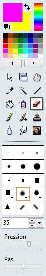 L’outil Gomme permet de « gommer » une partie de l’image. Pour l’utiliser, sélectionnez l’outil Gomme en cliquant sur l’icône Outil Gomme de la palette d’outils ou en appuyant sur la touche V du clavier. Plusieurs formes de gomme vous sont proposées. Celles accompagnées d’un signe + ont une taille ajustable. Les autres ont une taille fixe. Vous pouvez choisir l’intensité du gommage avec le curseur Pression :