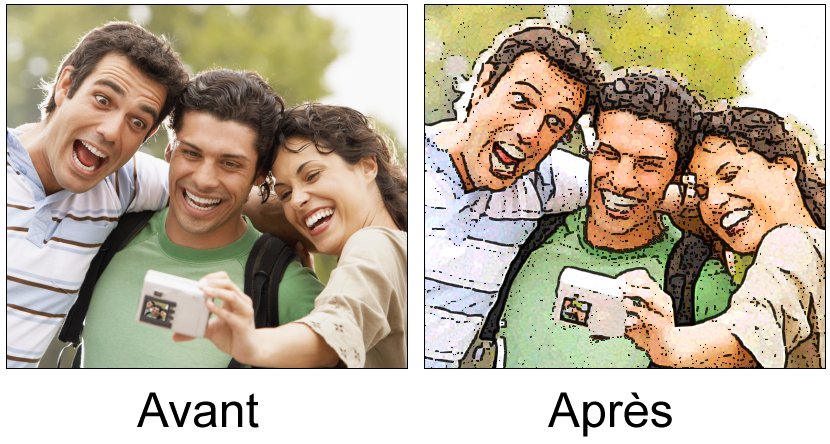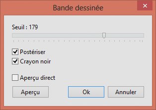A titre d’exemple, nous allons transformer cette image en lui appliquant le filtre Bande dessinée. Déroulez le menu Filtre, pointez Artistique et cliquez sur Bande dessinée. Cette action affiche la boîte de dialogue Bande dessinée :