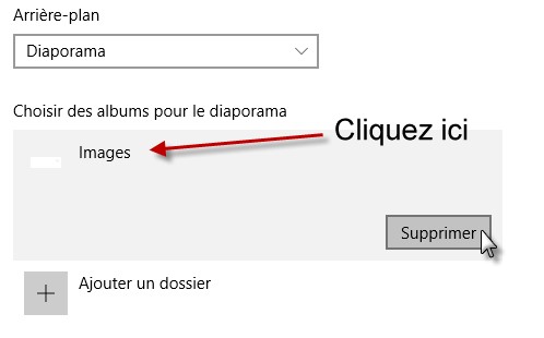 Windows 10 vous permet d’afficher un diaporama sur l’écran de verrouillage. Pour activer cette fonctionnalité, cliquez sur Démarrer, tapez verrouillage et cliquez sur Paramètres de l’écran de verrouillage. Cette action affiche la fenêtre Personnalisation, onglet Ecran de verrouillage sélectionné. Choisissez Diaporama dans la liste déroulante Arrière-plan. Par défaut, toutes les images du dossier Images seront utilisées dans le diaporama. Si vous le désirez, il est possible de supprimer ce dossier en cliquant sur Images :