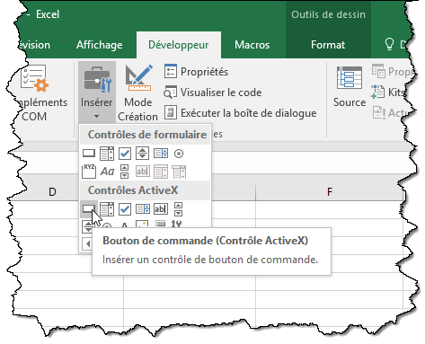 Basculez sur l’onglet Développeur. Dans le groupe Contrôles, cliquez sur l’icône Insérer, puis sur l’icône Bouton de commande (Contrôle ActiveX) :
