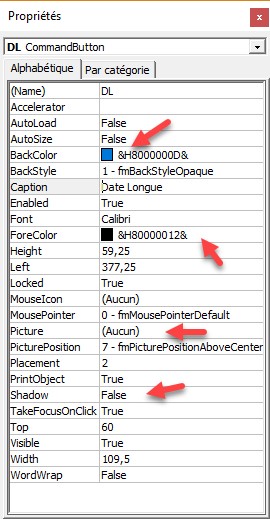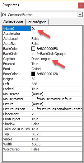 Cliquez du bouton droit sur le bouton de commande et sélectionnez Propriétés dans le menu. La boîte de dialogue Propriétés s’affiche. Utilisez les propriétés (Name) et Caption pour respectivement donner un nom au bouton de commande (ici, DL) et choisir son libellé (ici, Date Longue) :