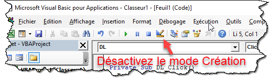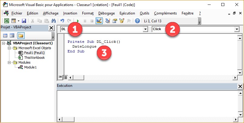 Sous l’onglet Développeur, dans le groupe Contrôles, cliquez sur Visualiser le code. Cette action affiche la fenêtre Microsoft Visual Basic pour Applications. Sélectionnez DL dans la première liste déroulante (1) et Click dans la seconde (3). Un code VBA s’affiche dans la partie centrale de la fenêtre. Entrez le nom de la macro (ici DateLongue) puis fermez la fenêtre Microsoft Visual Basic pour Applications :