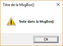 MsgBox "Texte dans la MsgBox()", vbExclamation, "Titre de la MsgBox()"
