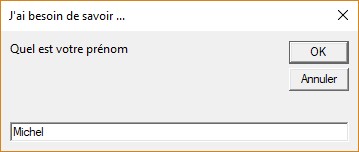 prenom = InputBox("Quel est votre prénom", "J'ai besoin de savoir)