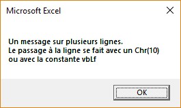 MsgBox "Un message sur plusieurs lignes." & Chr(10) & _ "Le passage à la ligne se fait avec un Chr(10)" & vbLf & _ "ou avec la constante vbLf"