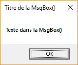 MsgBox "Texte dans la MsgBox()", , "Titre de la MsgBox()"