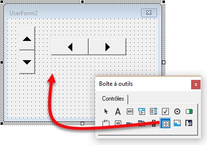 Pour insérer un contrôle SpinButton, sélectionnez l’outil Toupie dans la boîte à outils, puis tracez le contour voulu dans la boîte de dialogue personnalisée. Selon votre tracé, le contrôle sera horizontal ou vertical :