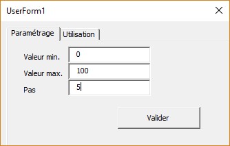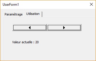 Private Sub CommandButton1_Click() With SpinButton1 .Min = TextBox1.Value .Max = TextBox2.Value .SmallChange = TextBox3.Value End With Label4.Caption = "Valeur actuelle : 0" MultiPage1.Value = 1 'Active la deuxième page End Sub
