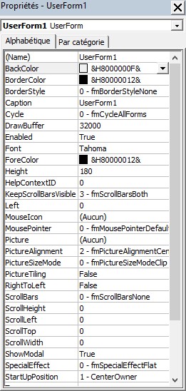 Les propriétés de la boîte de dialogue personnalisée sont regroupées dans la fenêtre Propriétés, dans l’angle inférieur gauche de la fenêtre Microsoft Visual Basic pour Applications. Il suffit de les modifier pour changer l’allure de votre UserForm :
