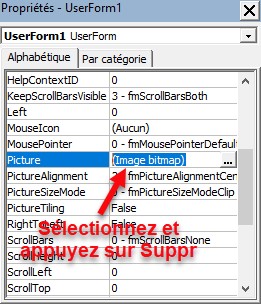 Si vous insérez une image d’arrière-plan dans un UserForm et que vous changez d’avis, vous vous demandez peut-être comment la supprimer. Eh bien, il suffit de sélectionner la valeur de la propriété Picture dans la fenêtre Propriétés et d’appuyer sur la touche Suppr du clavier :