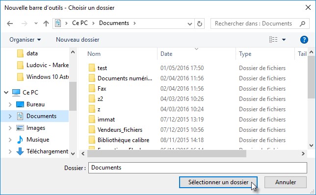 Cliquez du bouton droit sur une partie inoccupée de la barre des tâches, pointez Barres d’outils et cliquez sur Nouvelle barre d’outils. La boîte de dialogue Nouvelle barre d’outils s’affiche. Désignez le dossier pour lequel vous voulez créer un raccourci puis cliquez sur Sélectionner un dossier :