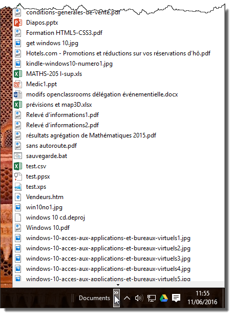 Un raccourci vers le dossier sélectionné est désormais accessible dans la partie droite de la barre des tâches. Il vous suffit désormais de cliquer sur les chevrons qui suivent le nom du dossier pour accéder aux fichiers et dossiers qui le composent, directement depuis la barre des tâches :