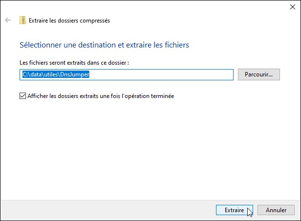 Allez sur la page https://www.sordum.org/7952/dns-jumper-v2-1/ et cliquez sur le bouton Download, tout en bas de la page. Lorsque le fichier DnsJumper.zip est téléchargé, affichez-le dans l’explorateur de fichiers, cliquez dessus avec le bouton droit de la souris et choisissez Extraire tout dans le menu contextuel. La boîte de dialogue Extraire les dossiers compressés s’affiche. Cliquez sur Extraire :
