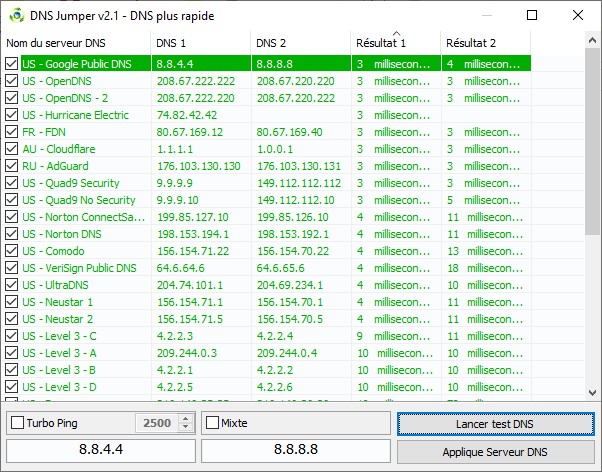 Pour connaitre le DNS le plus performant, cliquez sur DNS plus rapide. La boîte de dialogue DNS plus rapide s’affiche. Cliquez sur Lancer test DNS. Quelques secondes plus tard, vous avez quelque chose comme ceci :