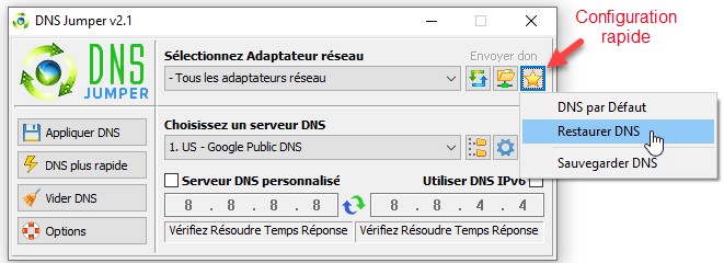 Lancez DNS Jumper. Cliquez sur l’icône Configuration rapide, en forme d’étoile et choisissez Restaurer DNS dans le menu :