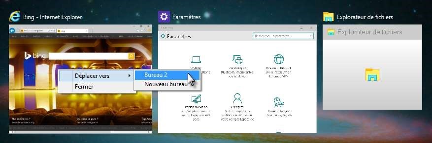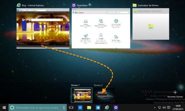 Pour transférer une application d’un bureau à un autre, cliquez sur l’icône Affichage des tâches ou appuyez sur Windows + Tab, puis glissez-déposez l’application sur la vignette du bureau destination :