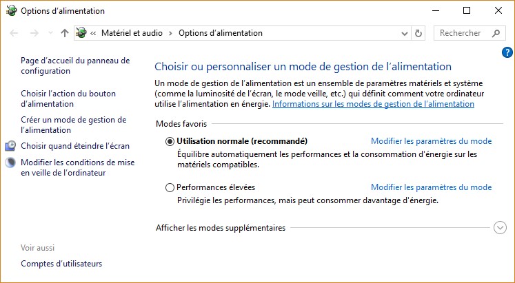 Cliquez sur Démarrer, tapez alimentation puis cliquez sur Choisir un mode de gestion d’alimentation dans la partie supérieure du menu Démarrer. La boîte de dialogue Options d’alimentation s’affiche :