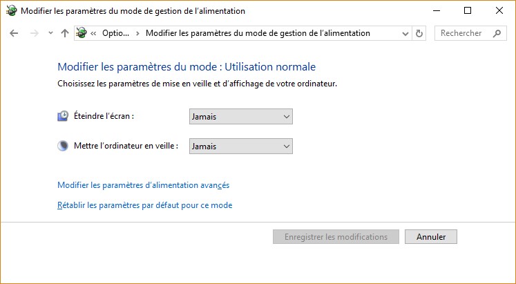 Dans la partie gauche de la boîte de dialogue, cliquez sur le lien Modifier les conditions de mise en veille de l’ordinateur. La boîte de dialogue Modifier les paramètres du mode de gestion de l’alimentation s’affiche :