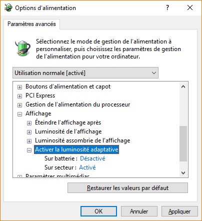 Cliquez sur le lien Modifier les paramètres d’alimentation avancés, dans la partie inférieure de la boîte de dialogue. Cette action déclenche l’affichage de la boîte de dialogue Options d’alimentation. Développez l’entrée Affichage et la sous-entrée Activer la luminosité adaptative et indiquez si vous voulez utiliser ou ne pas utiliser la luminosité adaptative, sur batterie et sur secteur :