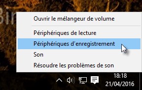Pour savoir si vous pouvez utiliser cette fonctionnalité sur votre ordinateur, cliquez du bouton droit sur l’icône qui représente un haut-parleur dans la zone de notifications et cliquez sur Périphériques d’enregistrement dans le menu :
