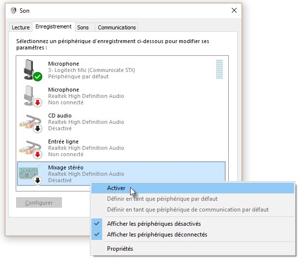 Assurez-vous que la mention Prêt est affichée pour ce périphérique. Dans le cas contraire, cliquez du bouton droit sur l’icône Mixage stéréo et choisissez Activer dans le menu :