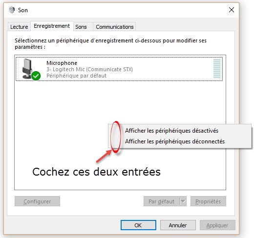 Si l’icône Mixage stéréo n’apparait pas dans la boîte de dialogue Son, cliquez du bouton droit dans la zone centrale de la boîte de dialogue et cochez les entrées Afficher les périphériques désactivés et Afficher les périphériques déconnectés :