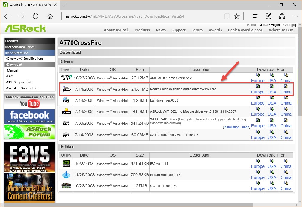 Tapez ce nom dans votre moteur de recherche préféré et vous aurez tôt fait de trouver le constructeur de la carte et son site Web. Il ne vous reste plus qu’à télécharger le pilote audio correspondant. Dans notre cas, la carte mère est « un peu » ancienne. Seuls des pilotes pour Windows XP et Windows Vista sont disponibles. Mais rassurez-vous, ces pilotes conviendront parfaitement pour Windows 10, à condition que vous preniez la version qui correspond à votre système : 32 bits ou 64 bits :