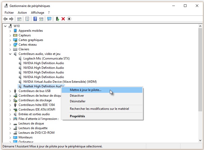 Pour mettre à jour votre pilote audio, cliquez du bouton droit sur Démarrer et choisissez Gestionnaire de périphériques dans le menu. La fenêtre du gestionnaire de périphériques s’affiche. Développez l’entrée Contrôleurs audio, vidéo et jeu, cliquez du bouton droit sur l’icône Realtek High Definition Audio (ou équivalent) et choisissez Mettre à jour le pilote dans le menu :
