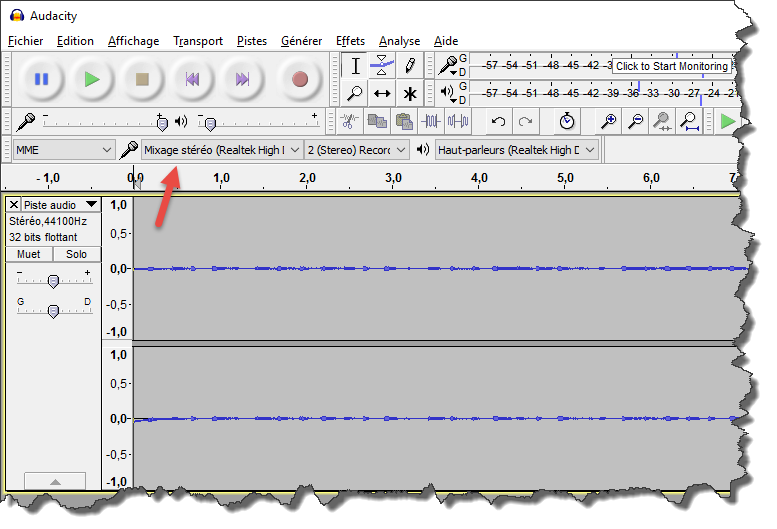 Maintenant, vous pouvez utiliser un logiciel d’enregistrement quelconque. Par exemple l’excellent Audacity, librement téléchargeable sur http://audacity.fr/. Lancez Audacity, choisissez Mixage stéréo dans la liste déroulante Recording device, Stereo dans la liste déroulante Recording channels et cliquez sur Record pour commencer l’enregistrement :
