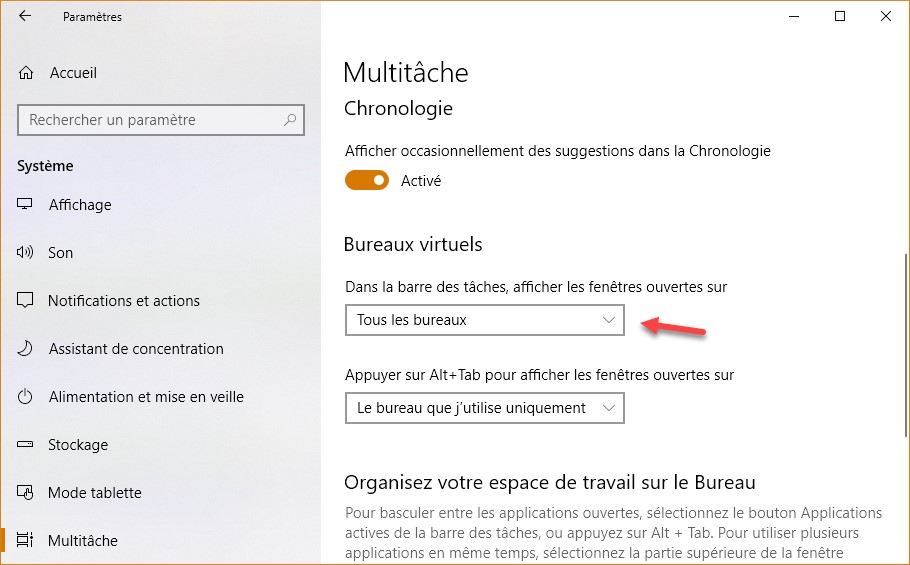 Cliquez sur Démarrer puis sur Paramètres. La fenêtre Paramètres Windows s’affiche. Cliquez sur Système. Une nouvelle fenêtre s’affiche. Dans son volet gauche, cliquez sur Multitâche. Une troisième fenêtre donne accès aux paramètres système. Sous Bureaux virtuels, déroulez la première liste déroulante et choisissez Tous les bureaux :