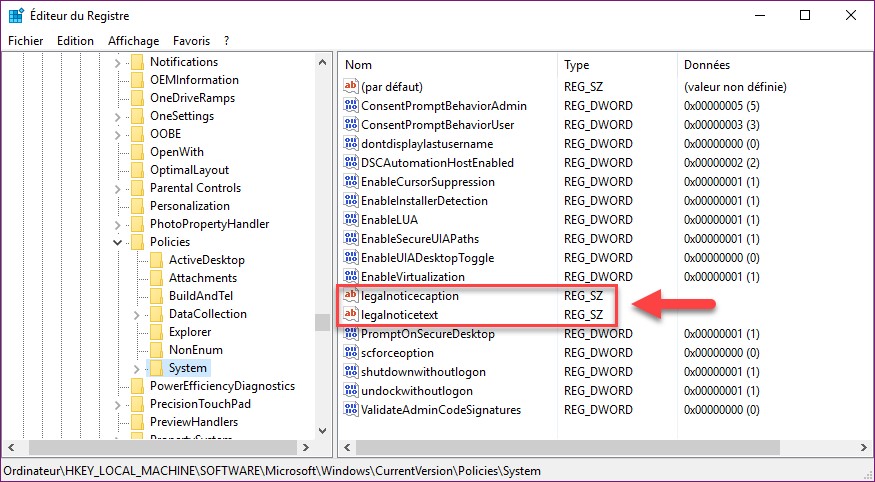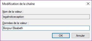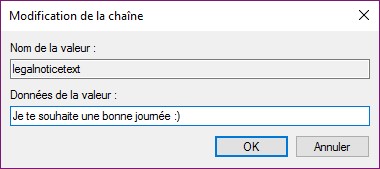 La valeur legalnoticecaption correspond au titre du message et la chaine legalnoticetext au texte du message. Double-cliquez sur l’une puis sur l’autre et définissez le titre et le texte du message que vous voulez afficher :