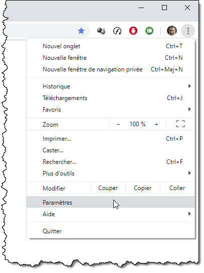 Cliquez sur l’icône Personnaliser et contrôler Google Chrome, dans l’angle supérieur droit de la fenêtre de Chrome, puis sélectionnez Paramètres dans le menu :