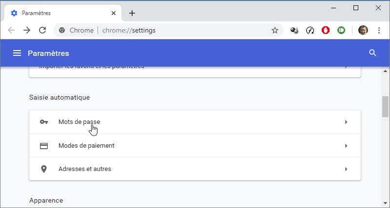 Cette action provoque l’affichage de la page chrome://settings. Sous Saisie automatique, cliquez sur Mots de passe :