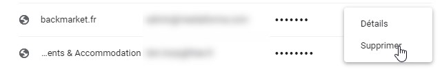 Pour supprimer vos identifiants pour un site, cliquez sur les points de suspension verticaux en face de ce site et sélectionnez Supprimer dans le menu :