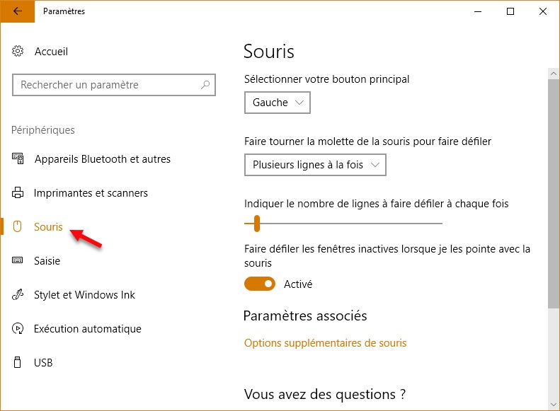 Cliquez sur Démarrer puis sur Paramètres. La fenêtre Paramètres Windows s’affiche. Cliquez sur l’icône Périphériques. Une nouvelle fenêtre s’affiche. Sélectionnez l’onglet Souris dans la partie gauche de cette fenêtre :