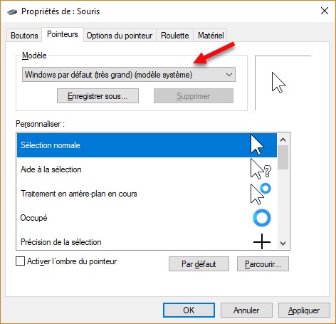 Sous Paramètres associés, cliquez sur Options supplémentaires de souris. Cette action affiche la boîte de dialogue Propriétés de souris. Basculez sur l’onglet Pointeurs et choisissez une forme de pointeur dans la liste déroulante Modèle :