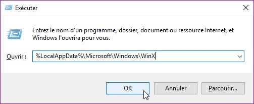 Appuyez simultanément sur les touches Windows et R du clavier. La boîte de dialogue Exécuter s’affiche. Tapez %LocalAppData%\Microsoft\Windows\WinX et cliquez sur OK :