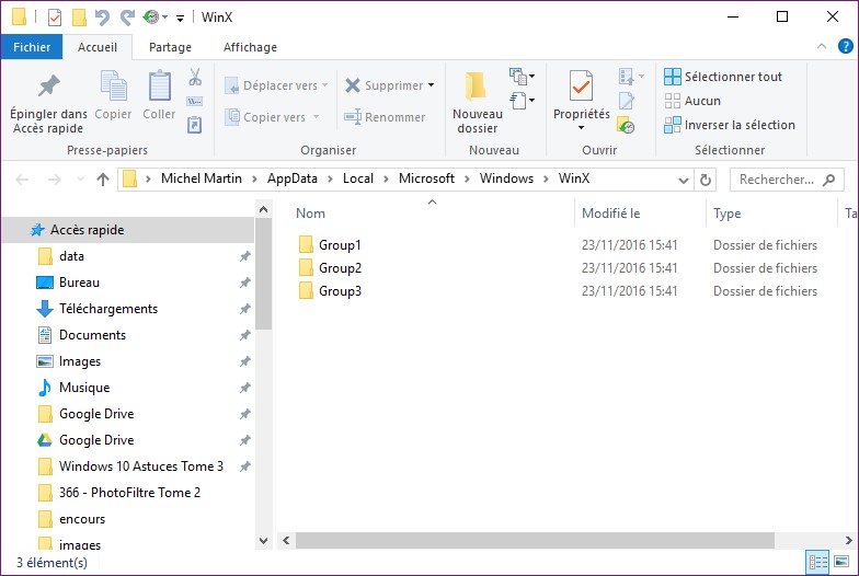 L’explorateur de fichiers s’ouvre sur le dossier WinX. Dans mon cas, il s’agit du dossier C:\Users\Michel\AppData\Local\Microsoft\Windows\WinX :