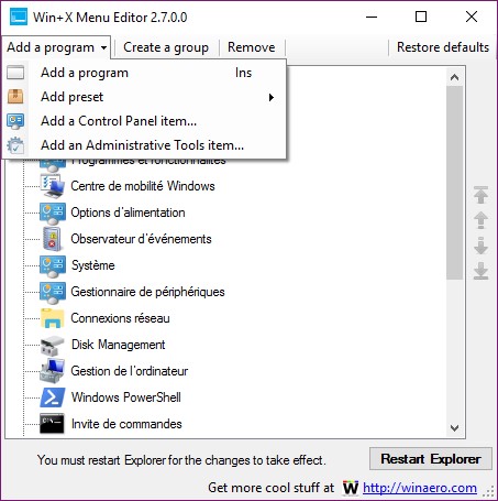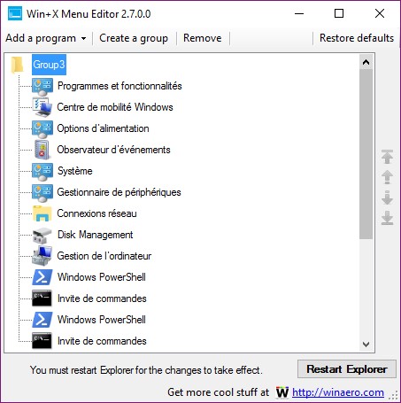 Voici la fenêtre de l’application Win+X Menu Editor :