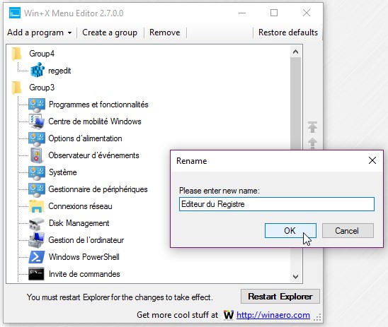 Par contre, pour ajouter une commande dans un groupe, il ne suffit pas de créer un raccourci : vous devez également modifier le Registre de Windows. Pour faciliter les choses, je vous conseille d’utiliser le programme Win+X Menu Editor, en vous rendant sur la page http://winaero.com/request.php?21. Une fois le fichier WinXMenuEditorRelease.zip téléchargé, dézipez-le et exécutez le fichier WinXEditor.exe qui se trouve dans le dossier X64 ou X86, selon si votre système d’exploitation est de type 64 ou 32 bits.