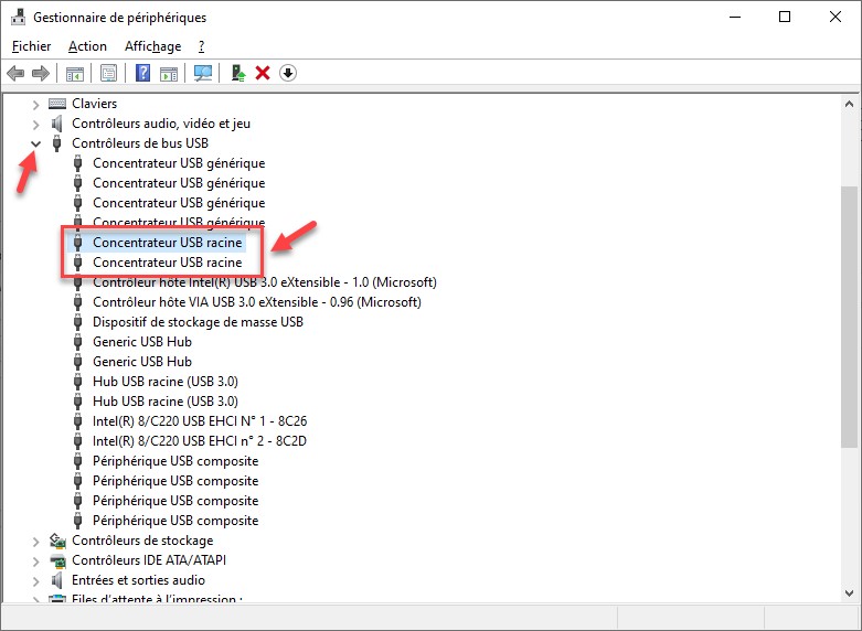 Cliquez sur Démarrer, tapez gestionnaire et cliquez sur Gestionnaire de périphériques dans la partie supérieure du menu Démarrer. Développez l’entrée Contrôleurs de bus USB en cliquant sur la flèche orientée vers la droite qui procède cette entrée. Repérez l’entrée ou les entrées Concentrateur USB racine :