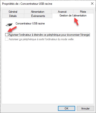 Validez en cliquant sur OK et recommencez les mêmes manipulations sur le ou les autres entrées Concentrateur USB racine si elles sont présentes dans la boîte de dialogue du gestionnaire de périphériques.
