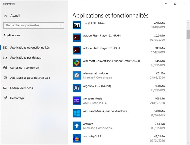 Passez en revue la liste alphabétique des applications. La taille et la date d’installation de chaque application sont affichées à droite de leurs icônes. Supprimez systématiquement toutes les applications que vous n’utilisez pas. Vous libèrerez ainsi de l’espace sur le disque principale et Windows ne s’en sentira que mieux.