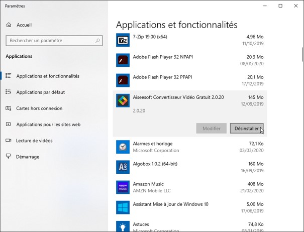 Pour supprimer une application, cliquez sur son nom, puis cliquez sur le bouton Désinstaller. Ici par exemple, nous sommes sur le point de désinstaller l’application Aiseesoft Convertisseur vidéo :