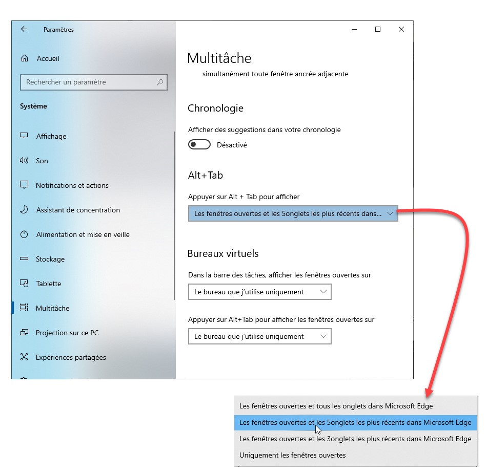 Cliquez sur Démarrer puis sur Paramètres, l’icône en forme de roue dentée. La fenêtre Paramètres Windows s’affiche. Cliquez sur l’icône Système, puis sur Multitâche dans la partie droite de la fenêtre. Pour paramétrer le fonctionnement de Microsoft Edge dans le raccourci Alt + Tab, déroulez la liste sous Alt + Tab et choisissez une des options proposées :