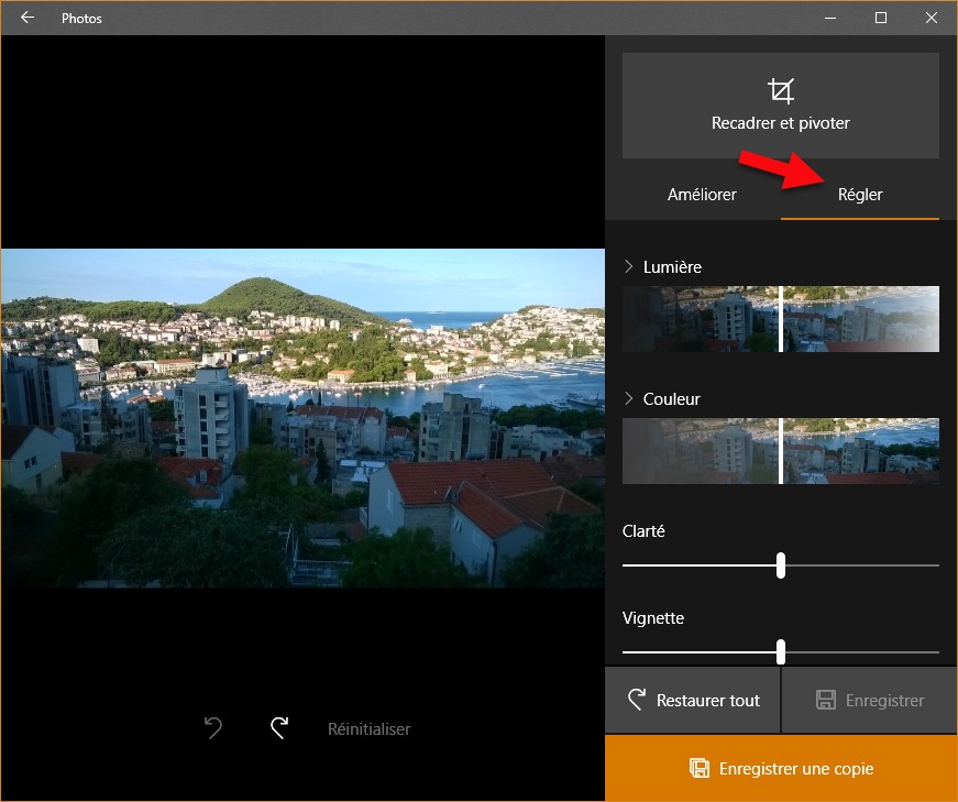 Enfin, vous pouvez également ajuster manuellement la lumière, la couleur, la clarté, le vignetage, et, pourquoi pas, les yeux rouges ou encore les boutons sur la peau en sélectionnant l’onglet Régler dans le volet droit :